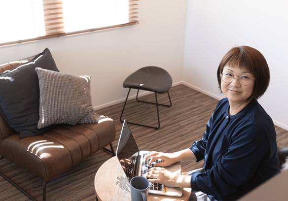 「アート建工は社員同士が何でも気さくに言い合える環境で、コミュニケーションが円滑です。社内チャットで作図中に気づいたことを列挙すると、設計さんやICさんがすぐに反応してくれて、良く検討して返事をくれたり、事案が改善されることも。分業化が徹底しているので、誰かひとりがワンオペ状態に陥るようなことはなく、立場や領域を超えて、メンバー全員が同じ方向を見ながら助け合っています。そういう健全な関係性が、家づくりの土台になっているように思います。良いものが生まれる、良い仕事になる、豊かな土壌を感じます。私自身も再チャレンジの思いがあり、チャンスをいただいたことに感謝して、図面の1本1本に心をこめて……毎日がとても充実しています。」